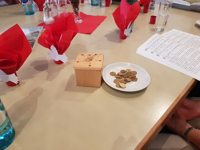 Wie immer hatte Irmtraut Hofmann unsere Tische liebevoll mit roten Servietten und einer weißen Taube, im Gedenken an das Pfingstfest, dekoriert.
